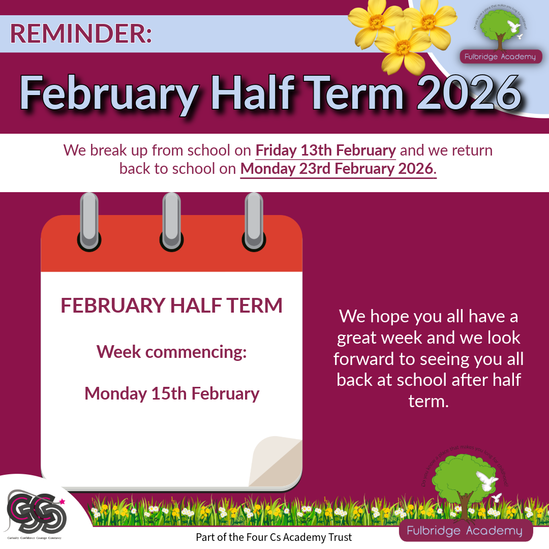 We break up from school today, Friday 13th February, and we return back to school on Monday 23rd February 2026.