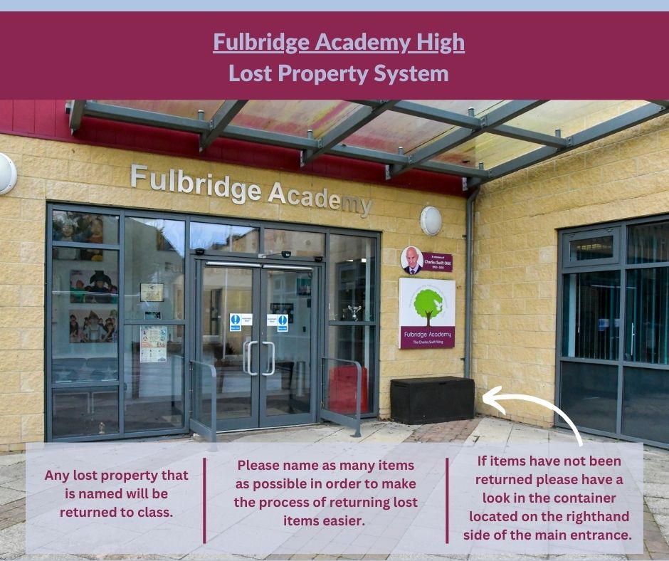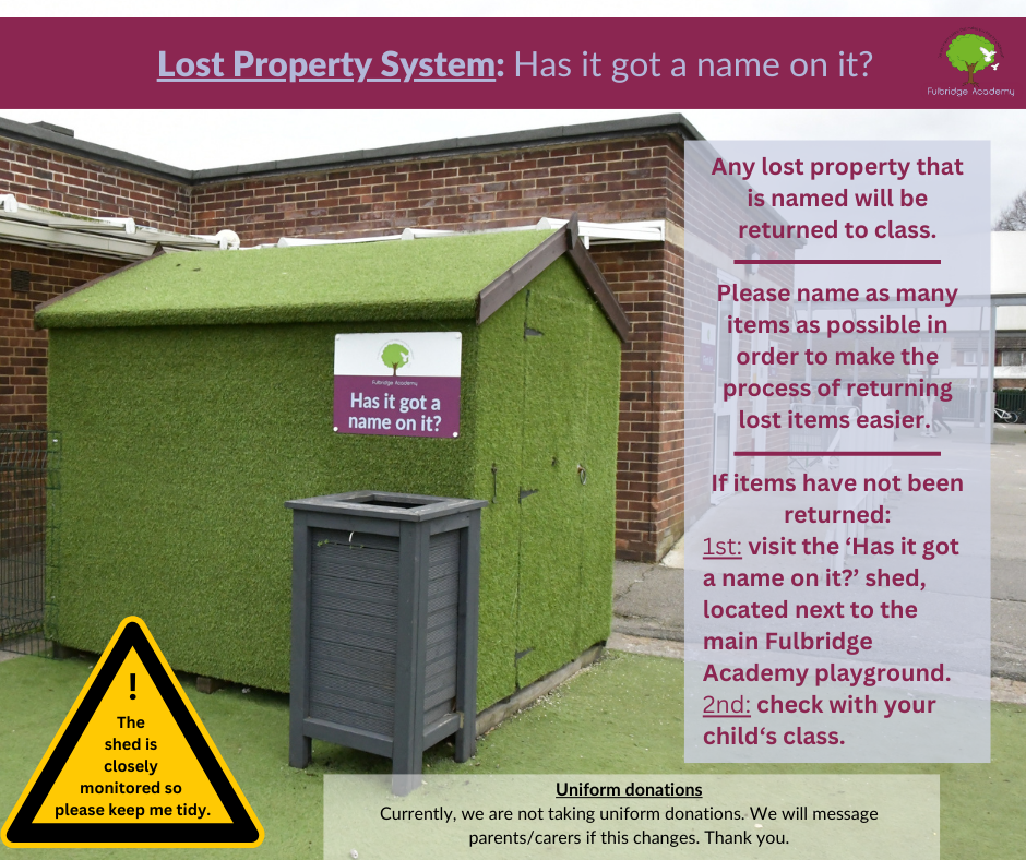Main Fulbridge Academy site: items will be put in the 'Has it got a name on it?" shed, located near the school library and 3G pitch.